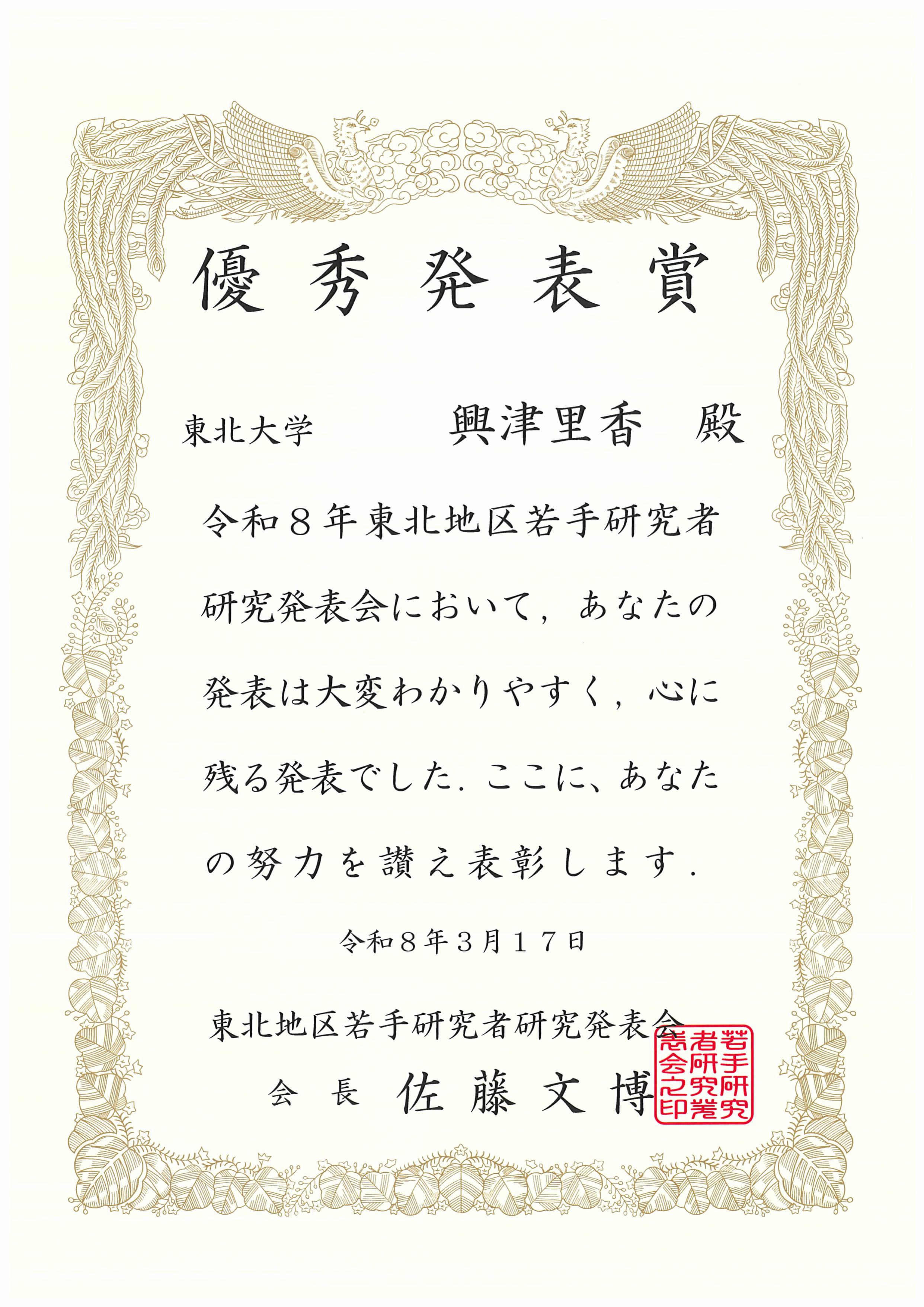 東北地区若手研究者研究発表会 優秀発表賞を受賞