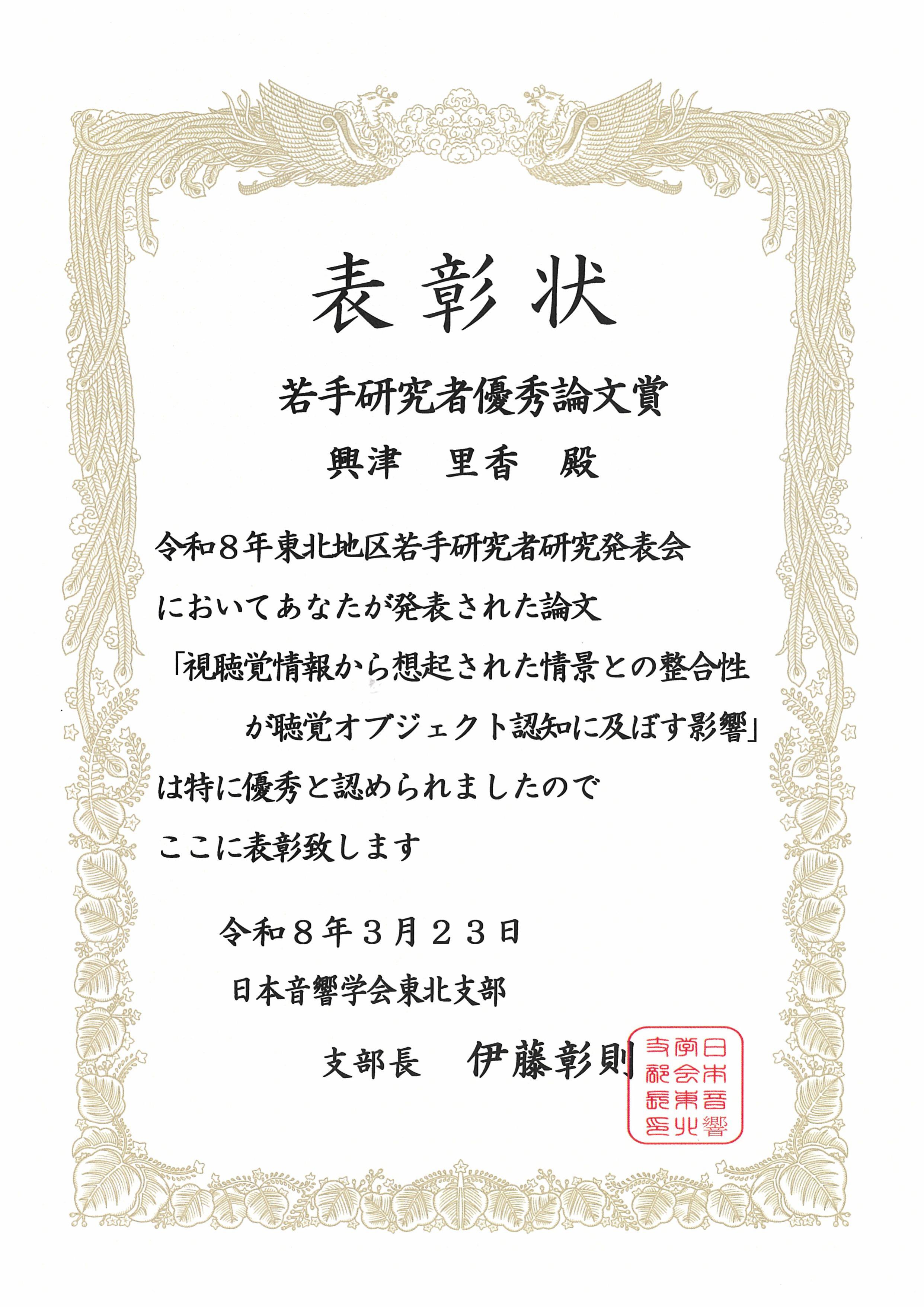 題目「視聴覚情報から想起された情景との整合性が聴覚オブジェクト認知に及ぼす影響」で,日本音響学会東北支部若手研究者優秀論文賞を受賞を受賞しました。